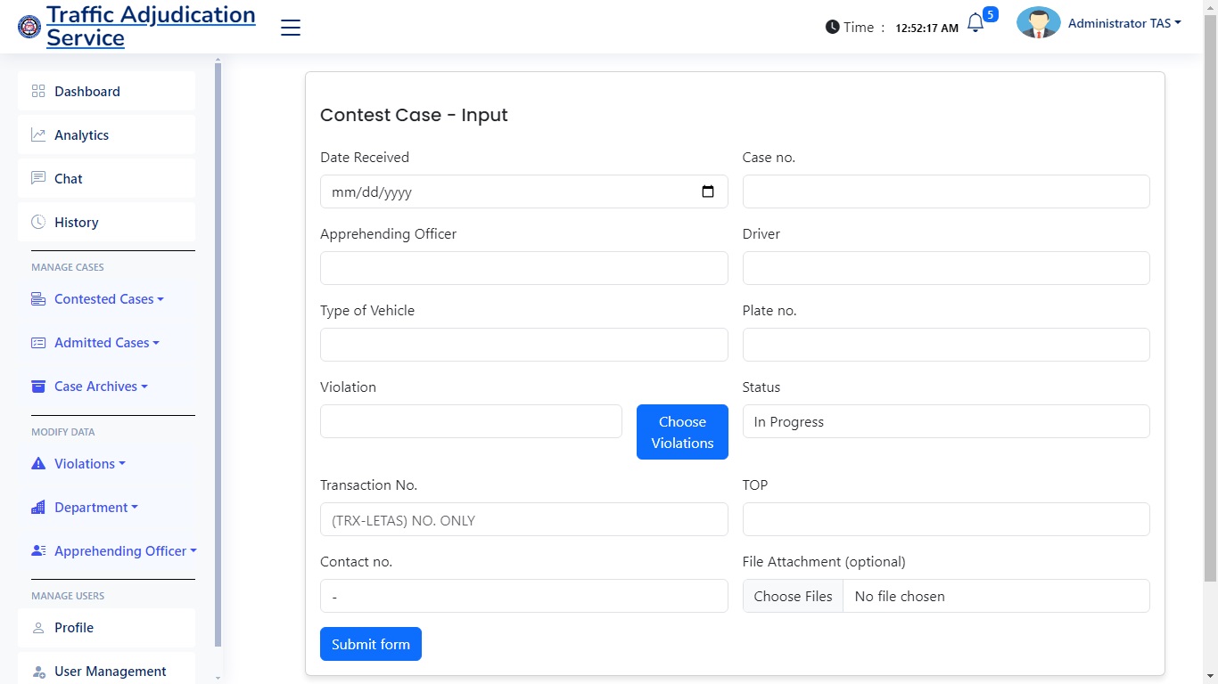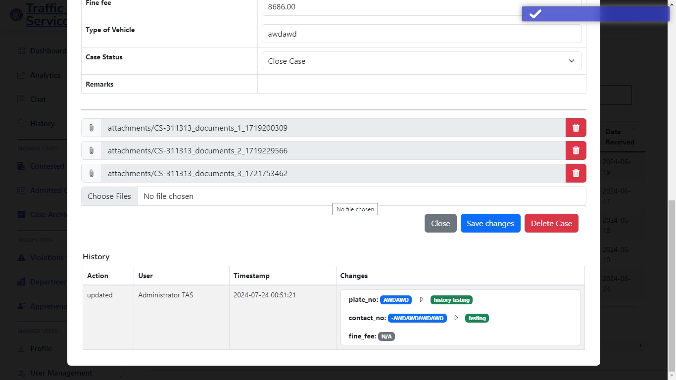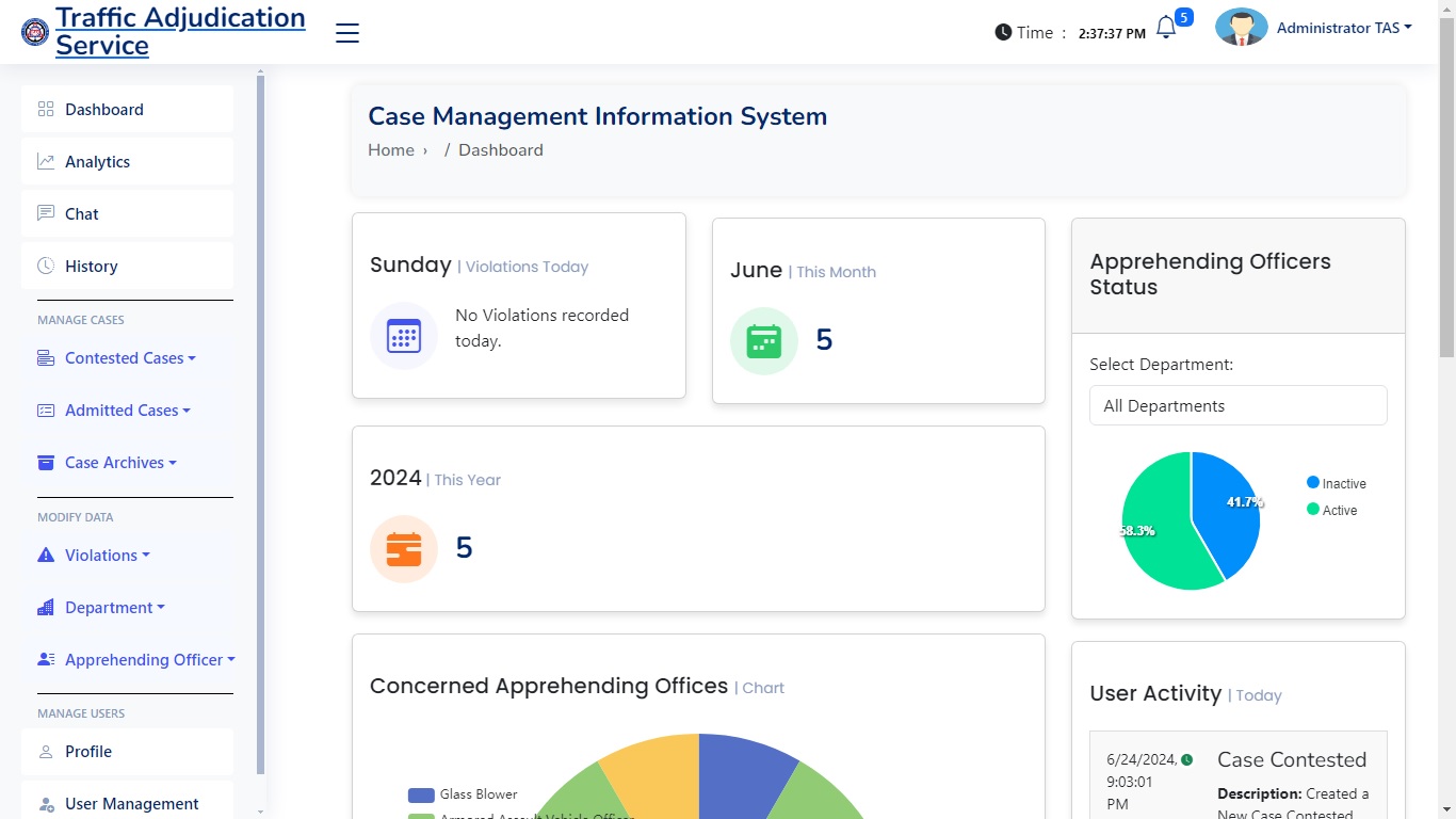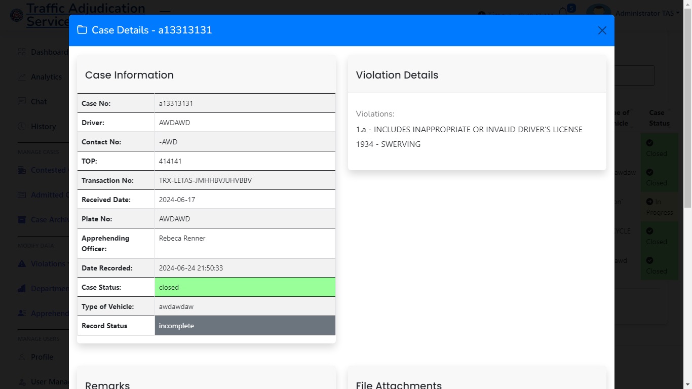 The Purpose of this web application is to handle and manage cases and reduce the manual work for 50%. With the ability to print automatically subpoena, has a analytics, audit trail, also a network local server system which the workers in the department of the traffic adjudication services can access.